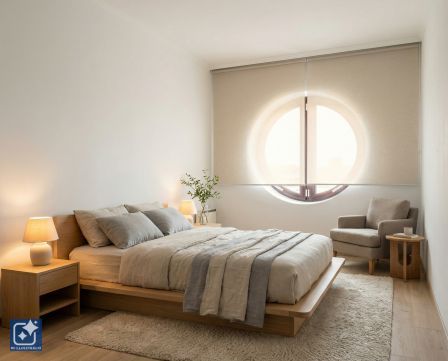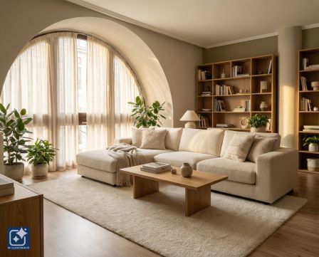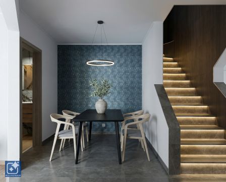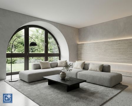 Design Living Room: The living room's character is defined by natural stone cladding, hidden lighting, and semi-circular windows overlooking the quiet inner park.