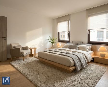 Upper Level: Ascending the modern staircase leads to an open study or relaxation corner. From here, the garden-facing master bedroom opens, along with two additional separate rooms oriented towards the Danube. The larger bedroom includes a French balcony with a direct view of the Danube and the Castle.